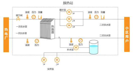 城市換熱站測控系統是通過對供熱系統的溫度、壓力、流量、開關量等進行測量、控制及遠傳,實現對供熱過程有效的遙測、遙感、遙控、遙調。城市換熱站測控系統是區域供熱系統中的重要組成部分,它將實時、全面了解供熱系統的運行工況,監測不利工況點的壓差,保證區域供熱系統安全合理地運行,并可根據運行數據進行供熱規劃和科學調配,為熱力部門提供準確、有效的重要數據。
